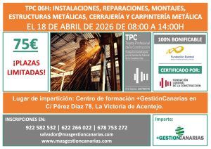 El 9 de mayo en horario de 08:00 a 14:00h . Lugar de impartición: Centro de formación +GestiónCanarias en C/ Pérez Díaz 78, La Victoria