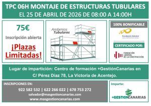Martes 25 de abril en horario de 08:00 a 14:00h. Lugar de impartición: Centro de formación +GestiónCanarias en C/ Pérez Díaz 78, La Victoria de