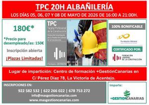 TPC 20h: Albañilería. Curso del y 5, 6, 7 y 8 de mayo de 2026 de 16:00 a 21:00h