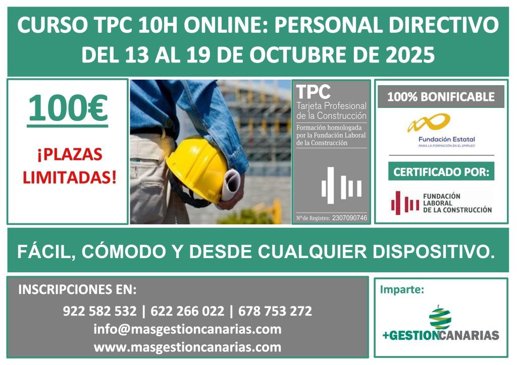 Del 13 al 19 de octubre. Online. El precio es de 100 euros. El curso es 100% Bonificable por Fundae y está certificado por la Fundación Laboral de la Construcción.