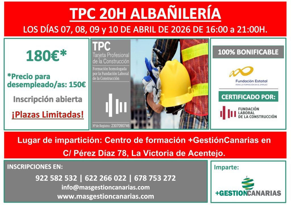 Los días 7, 8, 9 y 10 de abril de 2026 en horario de 16:00 a 21:00h. Lugar de impartición: Centro de formación +GestiónCanarias en C/ Pérez Díaz, 78, La Victoria de Acentejo. El precio es de 180 euros y 150 para desempleados/as. El curso es 100% Bonificable por Fundae y está certificado por la Fundación Laboral de la Construcción.